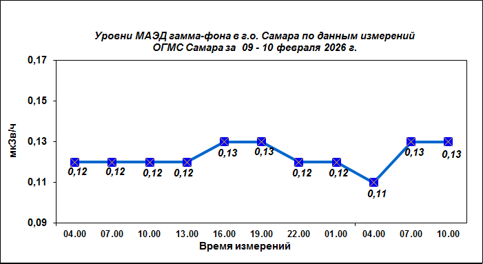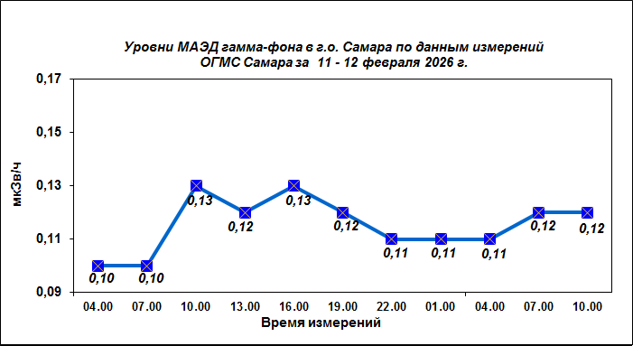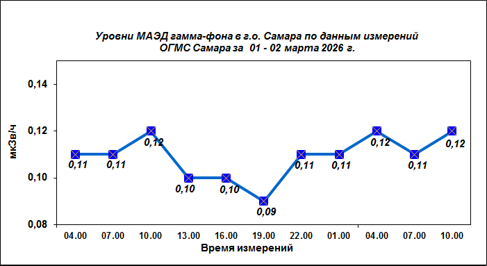 Результаты наблюдений за уровнем гамма-фона на метеостанции (ОГМС) Самара за последние сутки приведены на диаграмме: