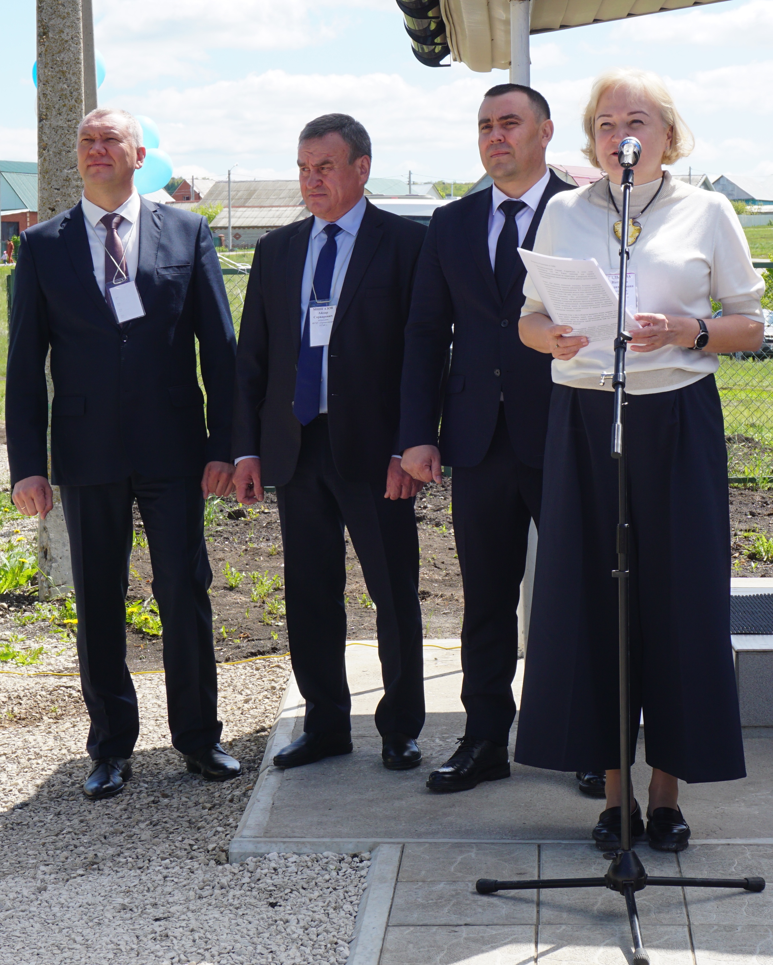 Начальник ФГБУ "Приволжское УГМС" Мингазов А.С. дает пояснения на метеоплощадке. Слева направо: Мингазов А.С., первый заместитель Главы администрации муниципального района Сергиевский Самарской области, начальник М-2 Серноводск Ерохина З.А., заместитель руководителя Росгидромета Радькова Н.В.