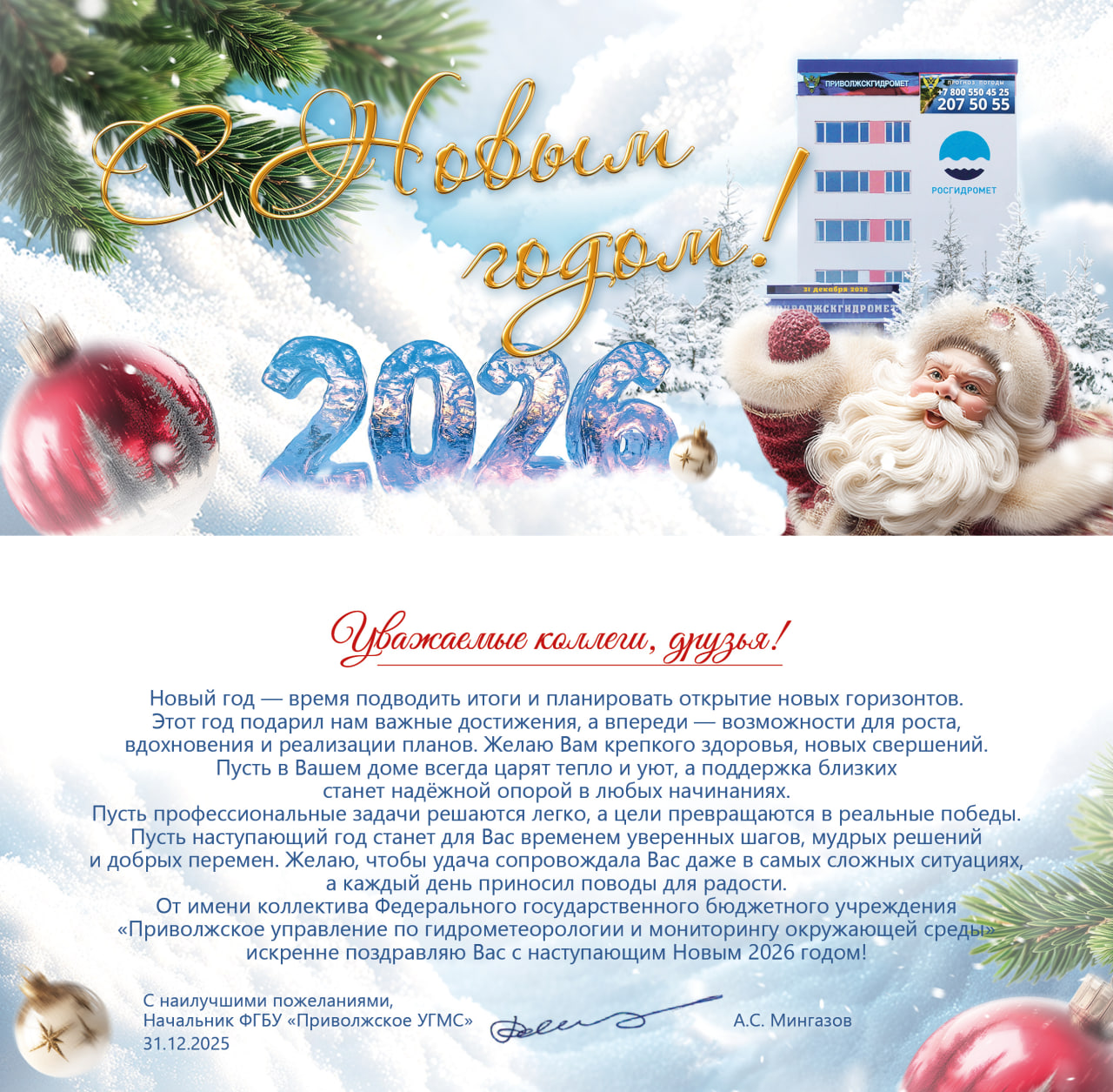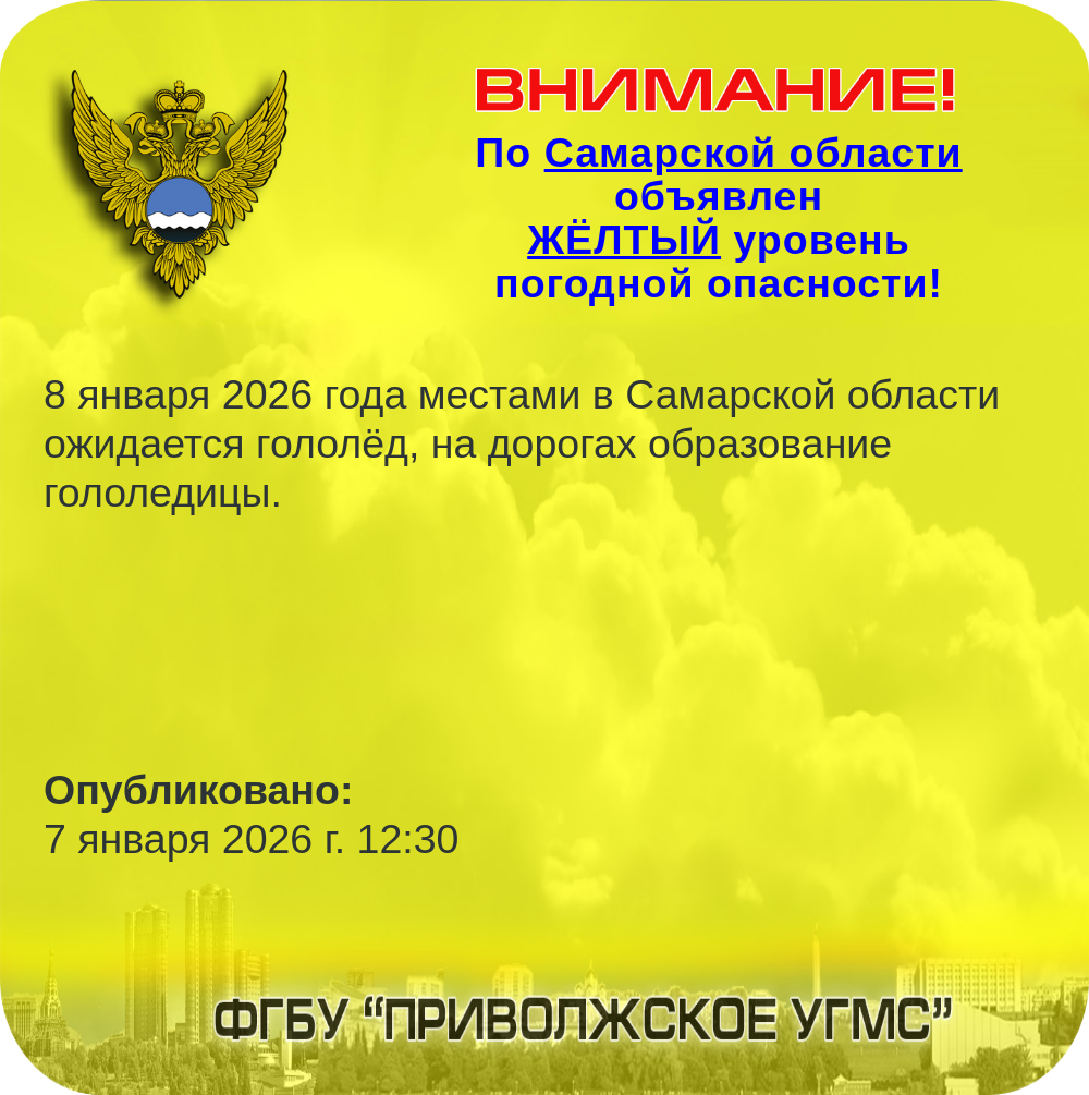 Новости Страница 1 из 217 Далее Погодное предупреждение по Самарской области 7 января 2026 г. 23:10 Самарская область Погодное предупреждение по Самарской области 7 января 2026 г. 12:30 Самарская область Погода 6-9 января 2026 года 5 января 2026 г. 15:48 ФГБУ "Приволжское УГМС" Средняя Волга - очередное снежное ненастье. 2 января 2026 г. 18:07 ФГБУ "Приволжское УГМС" Морозная погода Новогодних дней 29 декабря 2025 г. 14:08 ФГБУ "Приволжское УГМС" С наступающим 2026 годом! 29 декабря 2025 г. 12:17 ФГБУ "Приволжское УГМС" Прогноз погоды на январь 2026 года по территории ФГБУ "Приволжское УГМС" 29 декабря 2025 г. 9:02 ФГБУ "Приволжское УГМС" В ФГБУ "Приволжское УГМС" состоялся захватывающий интеллектуальный квиз "Гидрометштурм", который собрал 30 наших коллег из Самары и Тольятти!️ 26 декабря 2025 г. 13:37 ФГБУ "Приволжское УГМС" Зимний характер погоды 26 декабря 2025 г. 13:24 ФГБУ "Приволжское УГМС" Резкое похолодание на Средней Волге 22 декабря 2025 г. 14:56 ФГБУ "Приволжское УГМС" Страница 1 из 217 Далее Всего новостей: 6459