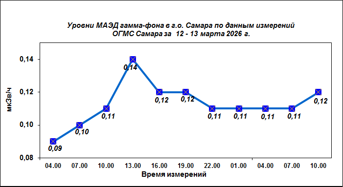 Результаты наблюдений за уровнем гамма-фона на метеостанции (ОГМС) Самара за последние сутки приведены на диаграмме: