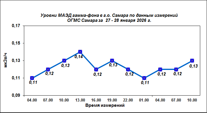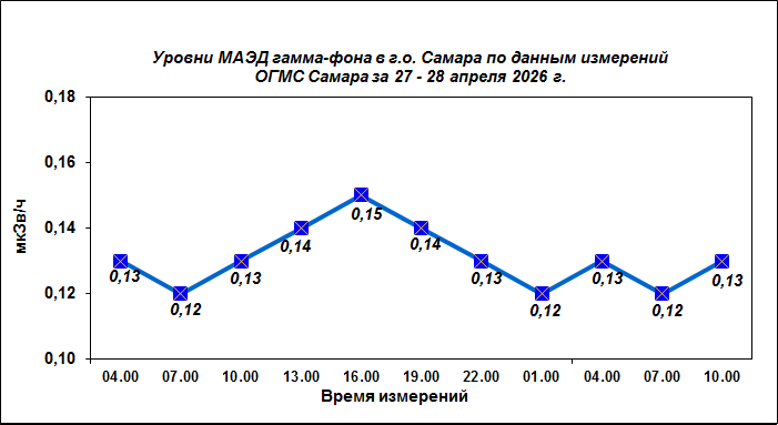 Результаты наблюдений за уровнем гамма-фона на метеостанции (ОГМС) Самара за последние сутки приведены на диаграмме: