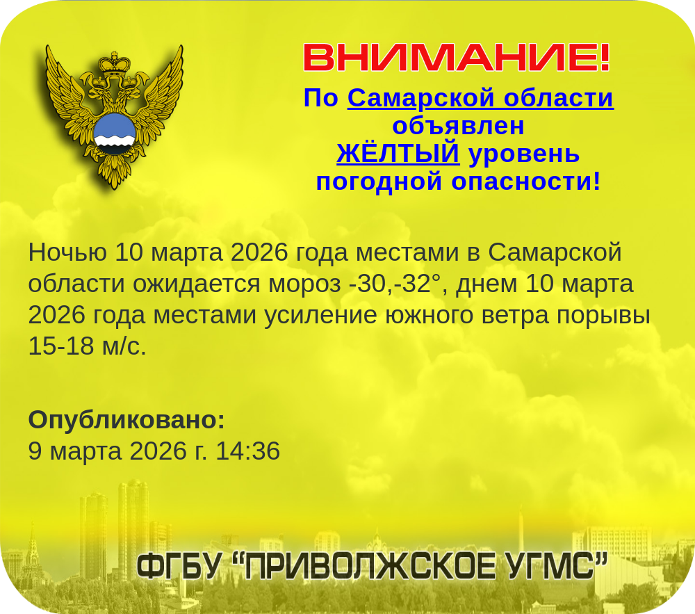 Новости Страница 1 из 220 Далее Абсолютный минимум температуры воздуха в Самарской области 10 марта 2026 г. 9:03 Самарская область Погодное предупреждение по Самарской области 9 марта 2026 г. 14:36 Самарская область От аномальных морозов к оттепели 9 марта 2026 г. 13:06 ФГБУ "Приволжское УГМС" Абсолютный минимум температуры воздуха в Cамарской области 9 марта 2026 г. 9:40 ФГБУ "Приволжское УГМС" Погода 7-9 марта 2026 года 6 марта 2026 г. 13:52 ФГБУ "Приволжское УГМС" Поздравляем с 8 Марта! 5 марта 2026 г. 17:58 ФГБУ "Приволжское УГМС" Погода первой недели марта на Средней Волге. 2 марта 2026 г. 15:59 ФГБУ "Приволжское УГМС" Теплое начало марта 27 февраля 2026 г. 15:37 ФГБУ "Приволжское УГМС" Прогноз погоды на март 2026 года по территории ФГБУ "Приволжское УГМС" 26 февраля 2026 г. 18:11 ФГБУ "Приволжское УГМС" Поздравляем с Днём Защитника Отечества! 23 февраля 2026 г. 15:00 ФГБУ "Приволжское УГМС" Страница 1 из 220 Далее Всего новостей: 6702