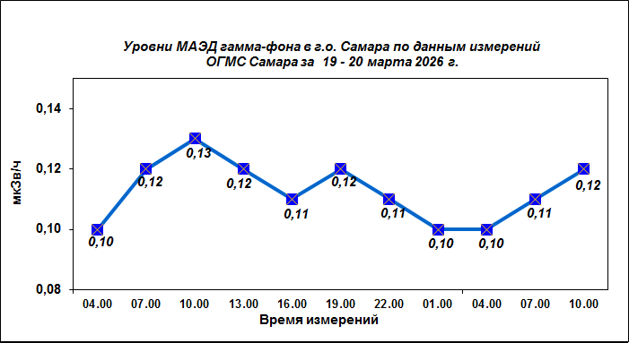 Результаты наблюдений за уровнем гамма-фона на метеостанции (ОГМС) Самара за последние сутки приведены на диаграмме: