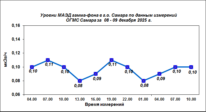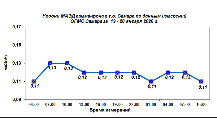 Результаты наблюдений за уровнем гамма-фона на метеостанции (ОГМС) Самара за последние сутки приведены на диаграмме: