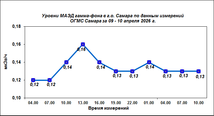 Результаты наблюдений за уровнем гамма-фона на метеостанции (ОГМС) Самара за последние сутки приведены на диаграмме:
